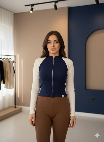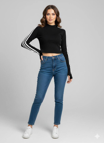 کراپ فانریپ آ ب یقه ایستاده رنگی 3 نوار فینگر دار تمام استین